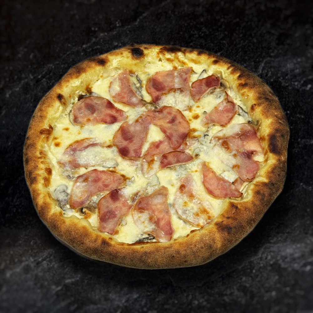 соус вершковий, печериці, салямі, шинка, помідор, опеньки мариновані, сир Моцарелла, кріп
