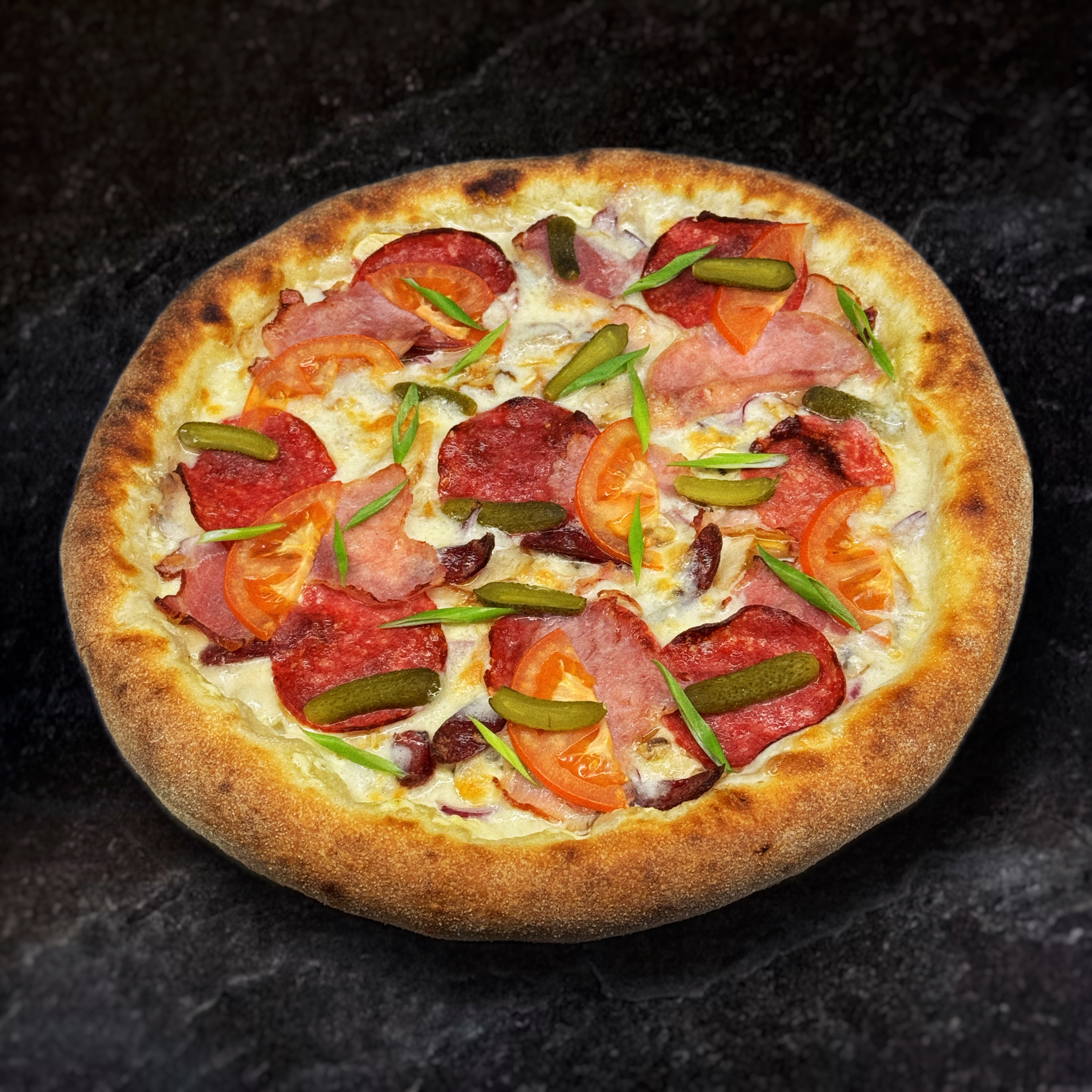 соус червоний, цибуля маринована, печериці, шинка, бекон, балик, помідор, корнішони, сир Моцарелла