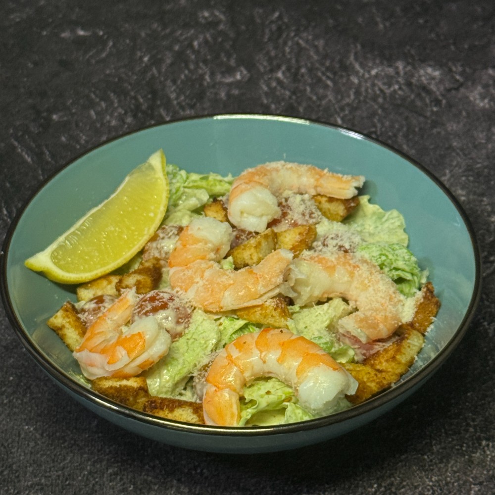 Тигрова креветка,салат айсберг,сухарики,помідори чері,сир пармезан,соус цезар,лимон