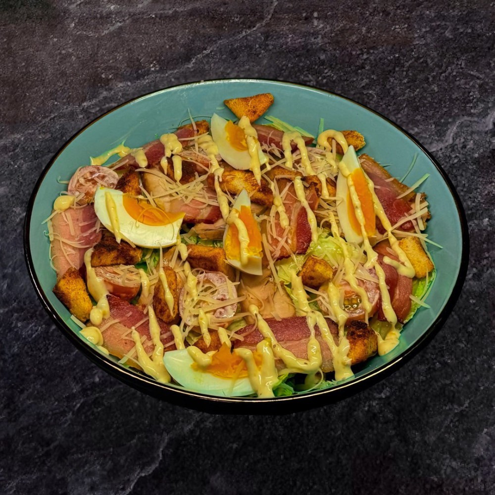 Смажена курка, бекон,яйце куряче,салат айсберг,сухарики,помідори чері,сир пармезан,соус цезар